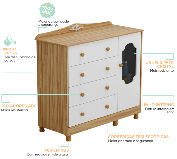 - Conjunto 100% MDF; - Conjunto nas cores branco ou branco com amêndoa; - Armário c/ 03 portas e com janelas de PETG cristal; - Armário e cômoda c/ 02 opções de rodapé; - Cômoda com janelas de PETG cristal; - Berço 3 em 1: vira minicama ou minisofá; - Berço com base do colchão c/ 2 opções de altura. Medidas: - Armário Tedy c/ 03 portas: Altura: 189 cm Largura: 92 cm Profundidade: 42 cm - Cõmoda: Altura: 88 cm Largura: 95 cm Profundidade: 42 cm - Berço: Altura: 97 cm Largura ou produndidade: 76 cm Comprimento: 132 cm