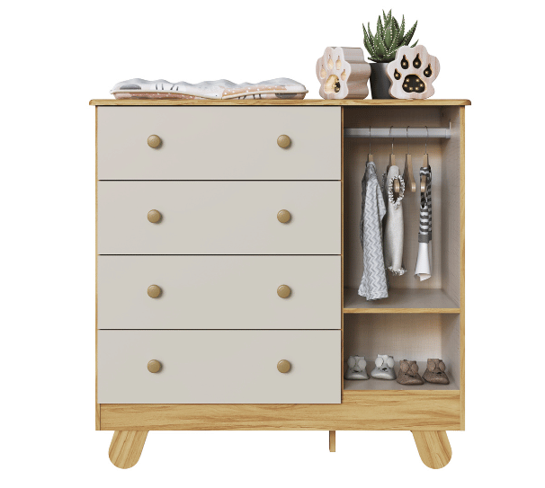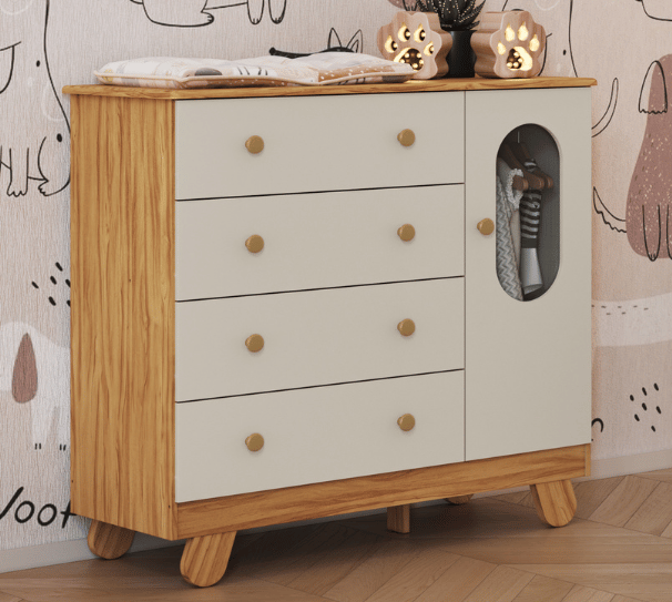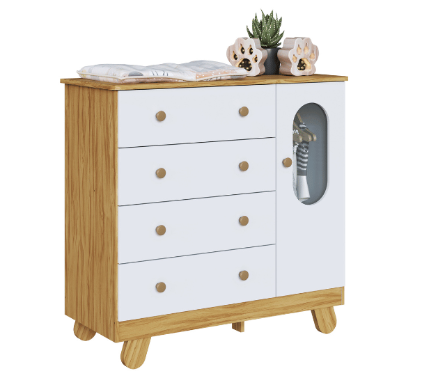 A Cômoda Tedy Peroba Movéis deixa qualquer quarto de bebê lindo com sua pintura laqueada. Produto 100% MDF, disponível nas versões Branco e Branco com Carvalho. Tampo com bordas laqueadas Gavetas com corrediças metálicas Pés plásticos já inclusos Disponível nas versões Branco e Branco com Carvalho. 01 cabideiro e 01 prateleira internos Medidas Altura: 880mm Largura: 953mm Profundidade: 420mm