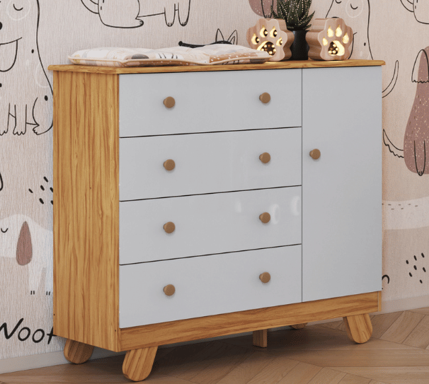 A Cômoda Tedy Peroba Movéis deixa qualquer quarto de bebê lindo com sua pintura laqueada. Produto 100% MDF, disponível nas versões Branco e Branco com Carvalho. Tampo com bordas laqueadas Gavetas com corrediças metálicas Pés plásticos já inclusos Disponível nas versões Branco e Branco com Carvalho. 01 cabideiro e 01 prateleira internos Medidas Altura: 880mm Largura: 953mm Profundidade: 420mm