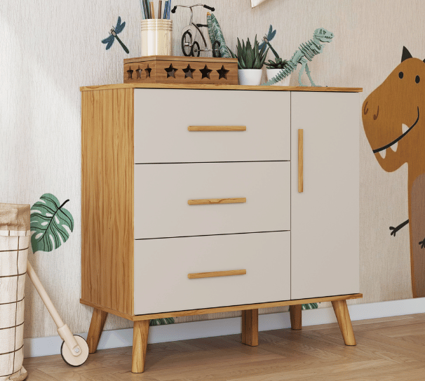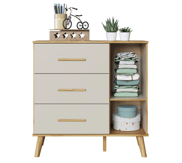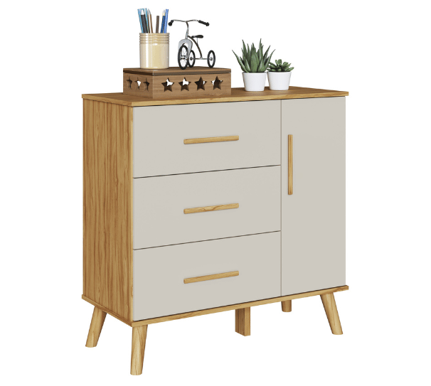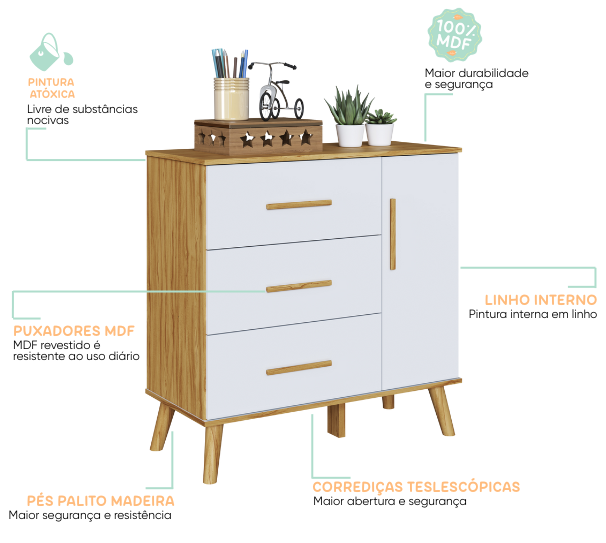– Alt: 906 mm – Larg: 969 mm – Prof: 450 mm – Pintura atóxica – Pintura branca em escala brilho – Pintura amêndoa em escala semibrilho – Acabamento interno em pintura textura linho – Pés usinados em peça maciça de MDF 25 mm – Puxadores em MDF revestido – Corrediças telescópicas