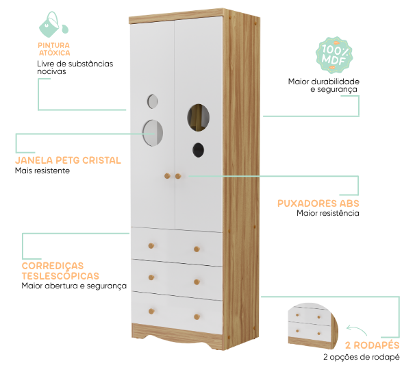 – Alt: 2100 mm – Larg: 1272 mm – Prof: 450 mm – Produto 100% MDF – Pintura atóxica – Pintura branca em escala brilho – Pintura amêndoa em escala semibrilho – Acabamento interno em pintura textura linho – Pés usinados em peça maciça de MDF 25 mm – Puxadores em MDF revestido – Cabideiro metálico – Corrediças telescópicas