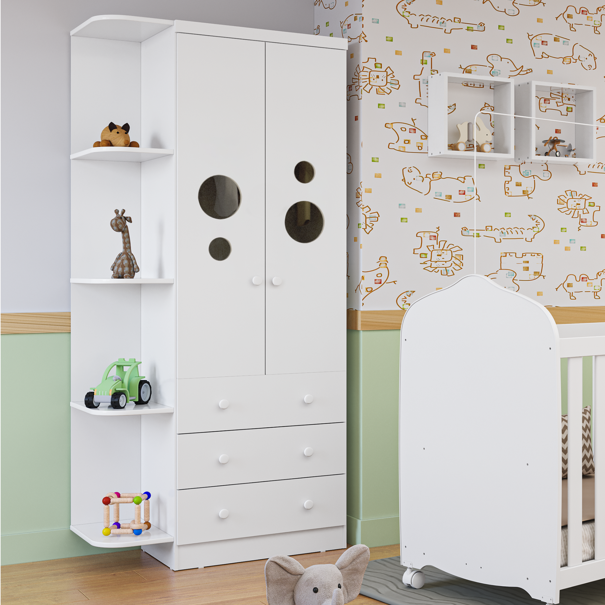 Dimensões(Cm): Comprimento(Profundidade): 76cm x Largura: 133cm x Altura: 95cm CARACTERÍSTICAS DE MÓVEIS Tipo de Estrutura do Móvel - 100% MDF Tipo de Pintura - UV Tipo de Acabamento da Pintura - Semi Brilho - Atóxica Tipo de puxador - MDF Quantidade de Prateleiras - 5 Prateleiras Quantidade de Gavetas - 2 Gavetas Diferenciais da Gaveta - c/ Corrediças Telescópicas Quantidade de Portas - 3 Portas de Abrir Garantia - 3 meses BENEFÍCIOS DE MÓVEIS Certificação de Qualidade de Móveis - Qualidade Aprovada 01 - CARACTERÍSTICAS E BENEFÍCIOS GERAIS Quantidade de Portas - 3 Portas de Abrir Quantidade de Gavetas - 2 Gavetas Quantidade de Prateleiras - 5 Material da Estrutura - MDF Tipo de Pintura - Ultravioleta Garantia - 3 Meses Certificação de Qualidade - Certificação de Qualidade Aprovada 04 - CARACTERÍSTICAS E BENEFÍCIOS DOS MÓVEIS DE QUARTO Tipo de Cabideiro - Aéreo Tamanho do Guarda-Roupa - Infantil
