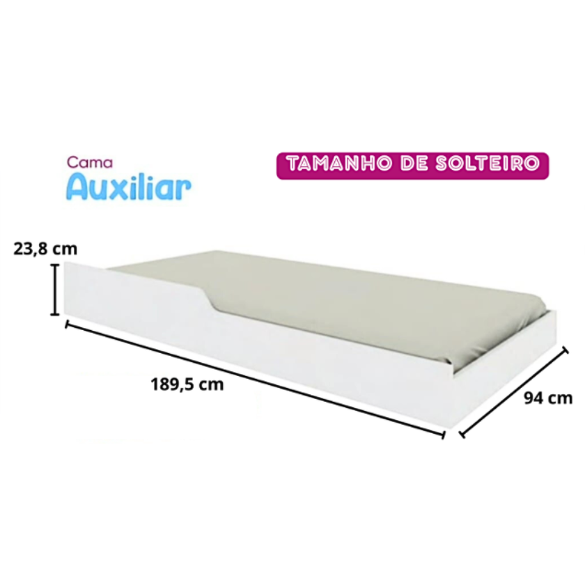 CARACTERÍSTICAS DA CAMA AUXILIAR: - 100% em MDF - Cor branco brilho - Com rodinhas - Tamanho solteiro padrão - Para colchão de solteiro de 188 x 88 x 12 ou 14 cm de altura Medidas da cama: Altura: 23,8 cm Comprimento: 189,5 cm Profundidade: 94 cm