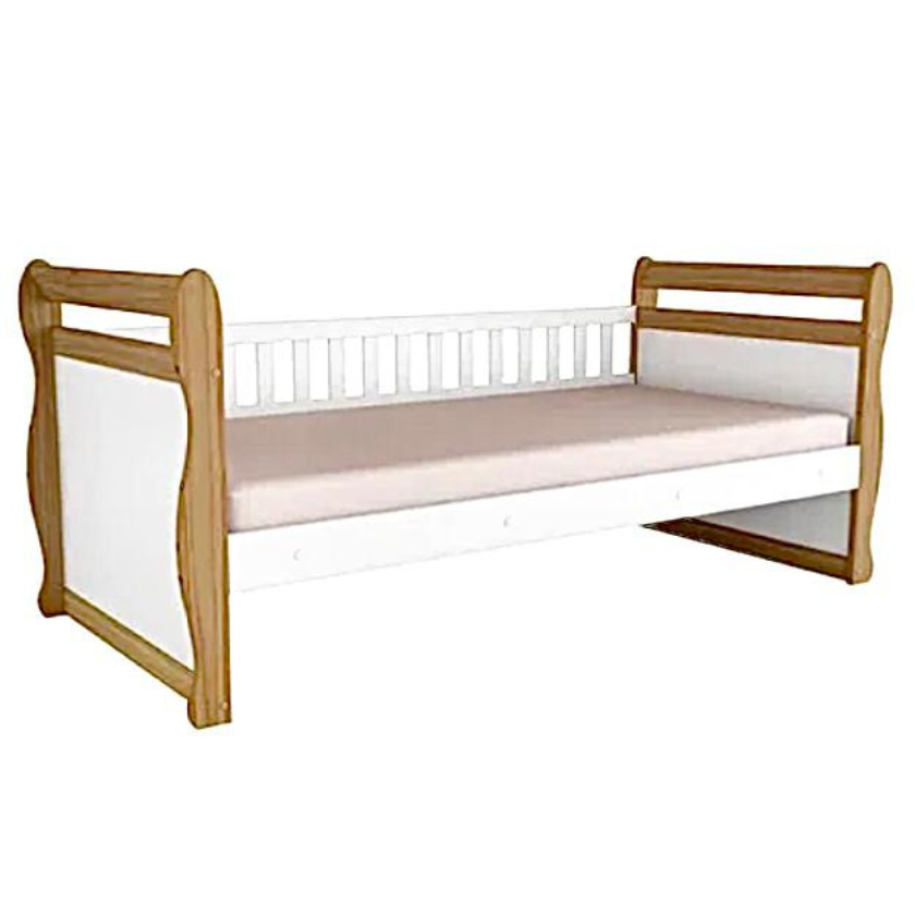 A cama Maria Simples pode ser toda branca ou branco com amêndoa (madeira).